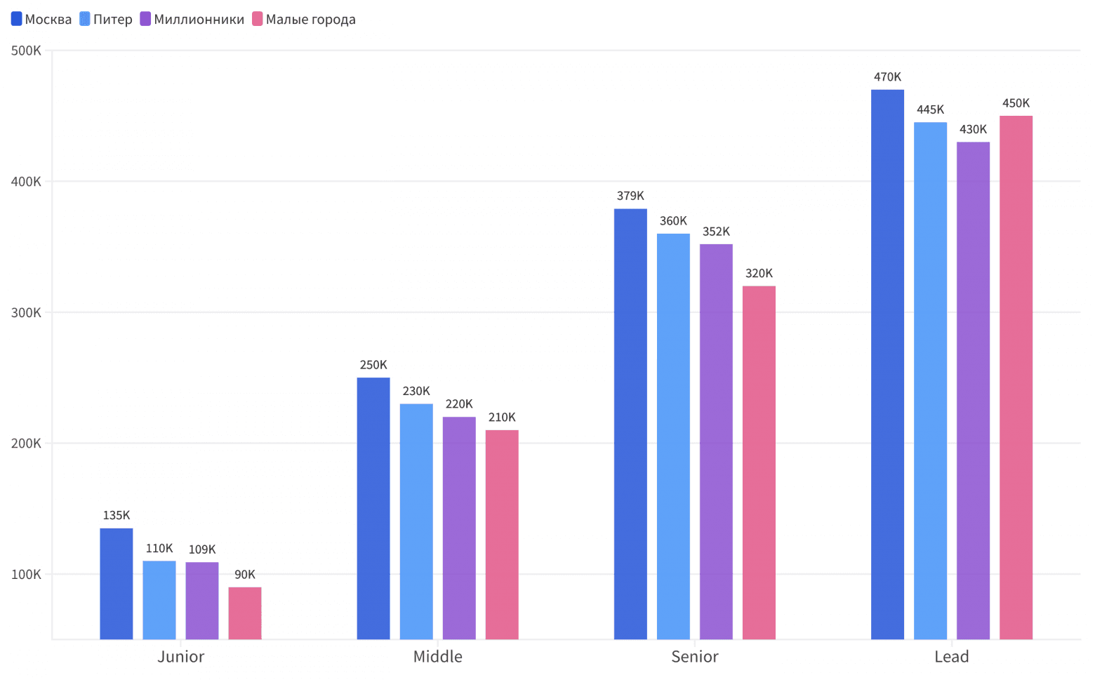 Принято считать, что в Москве платят больше всех. Давайте посмотрим на медианную ЗП по каждому грейду: