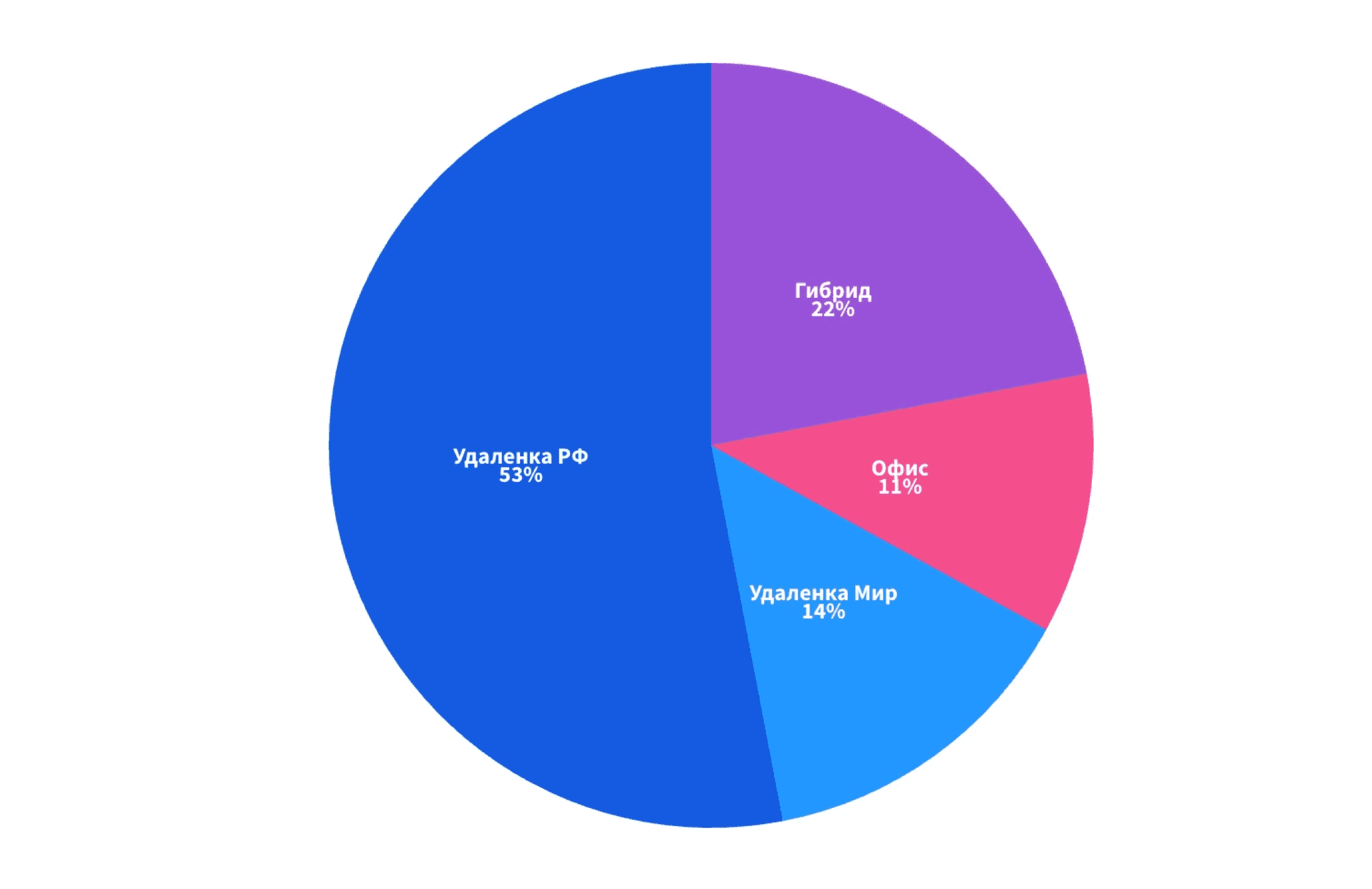 67% из нашей выборки - на удаленке и только треть ходит в офис - Гибрид у 22% и офис только у 11%.