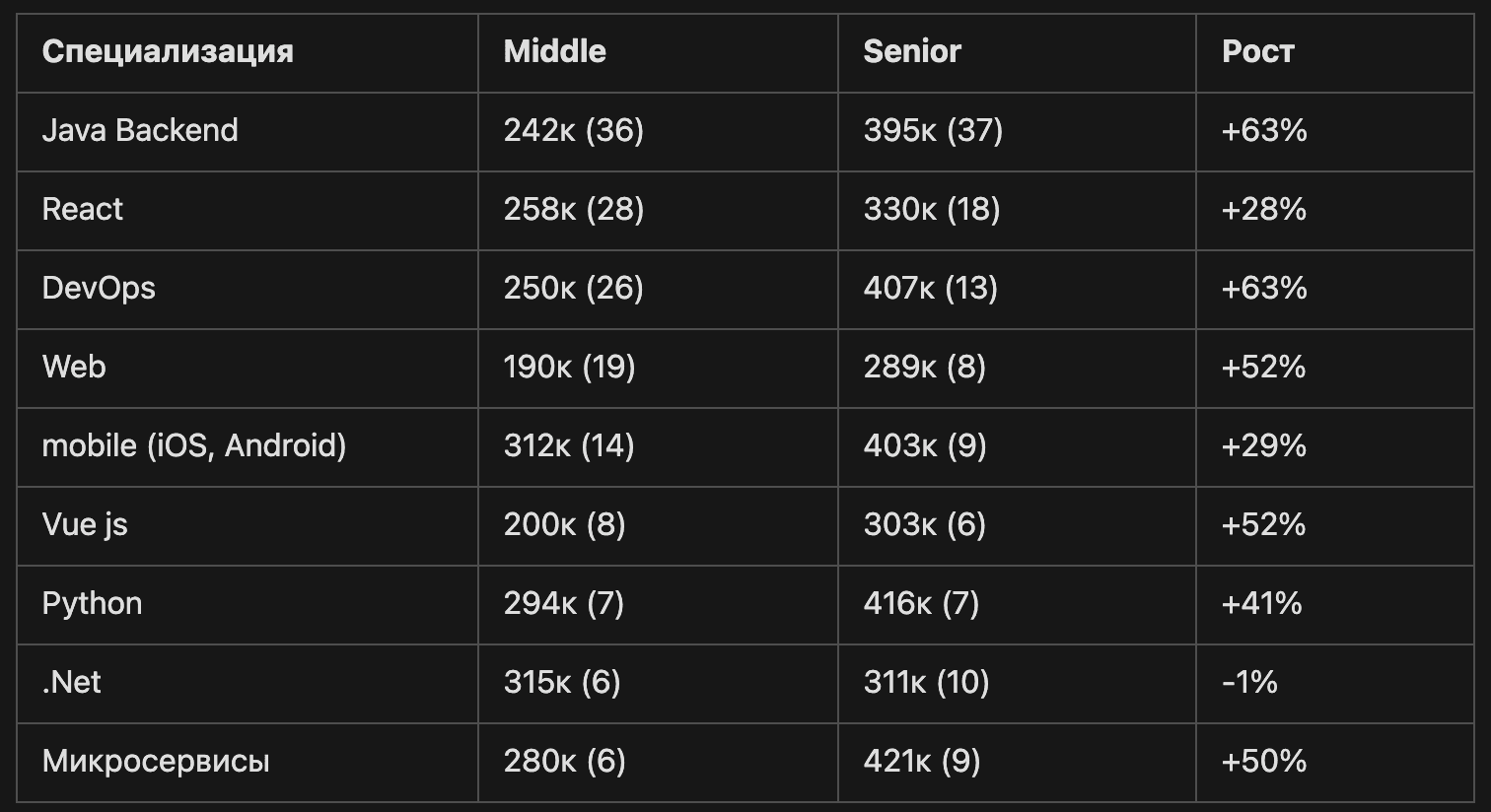Senior Фронтендеры (React, Vue, Web) — ниже остального рынка. Потолок 289-330к против 400к+ у бэкенда и DevOps.