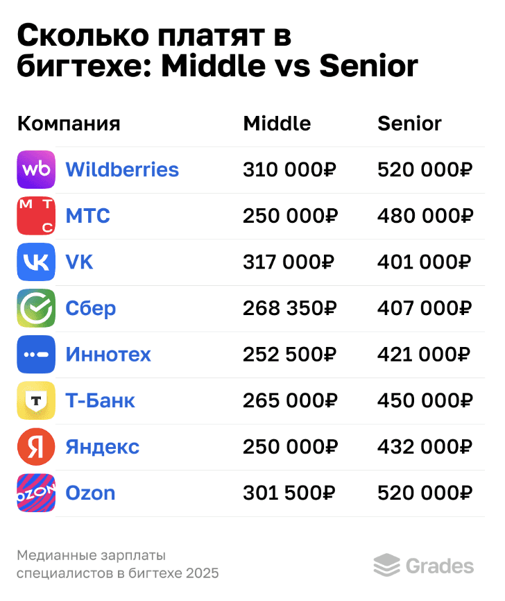 Маркетплейсы в топе по зарплате на обоих грейдах — Wildberries и Ozon платят больше всех и миддлам и сениорам.