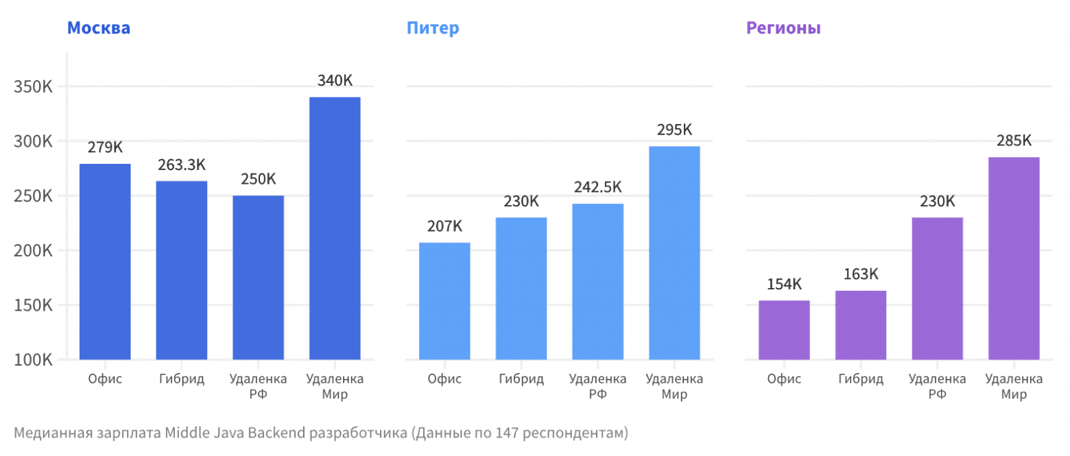 Мы решили посмотреть, а как различается ЗП у тех кто ходит в офис и работает на удаленке и сделать это в том же разрезе по ГЕО. Для примера мы посмотрели на зарплаты Middle Java Backend разработчиков: