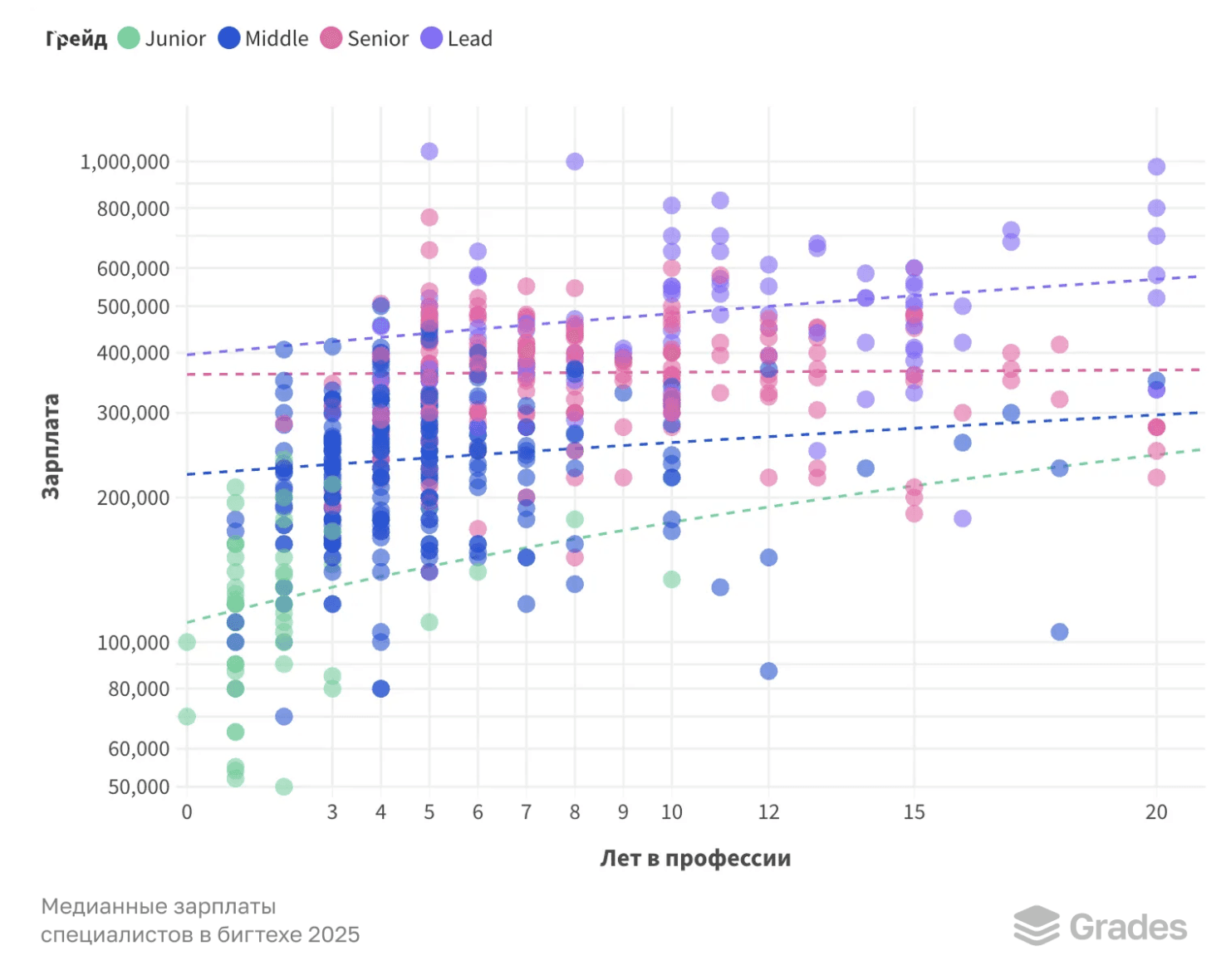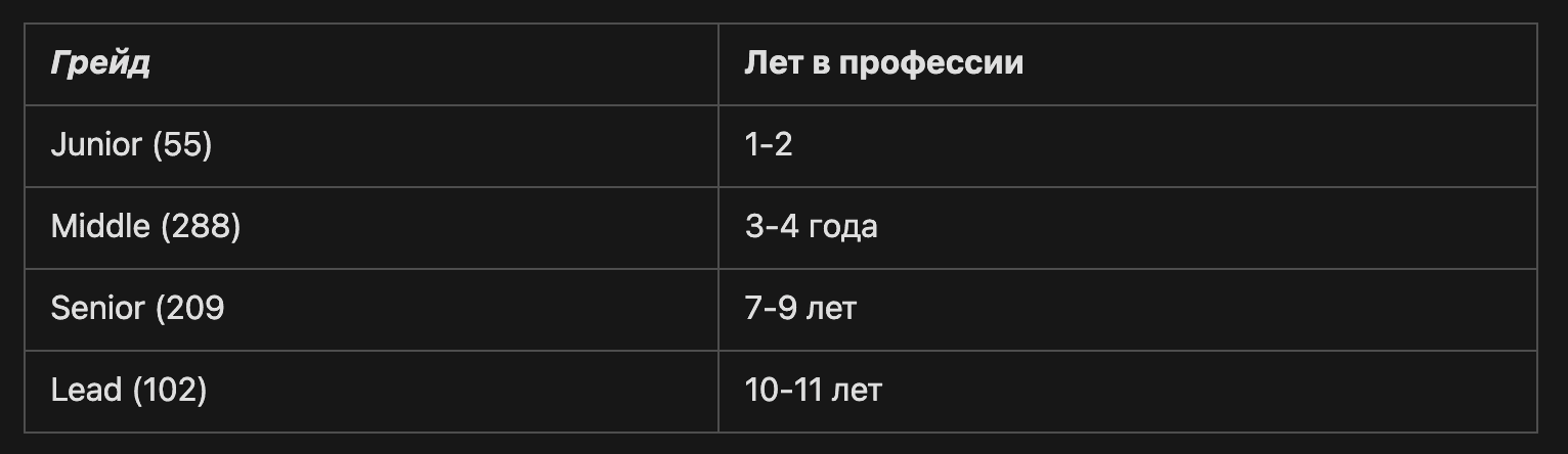 Сколько лет нужно работать, чтобы вырасти до лида? Мы посмотрели средний медианный опыт специалистов на каждом грейде: